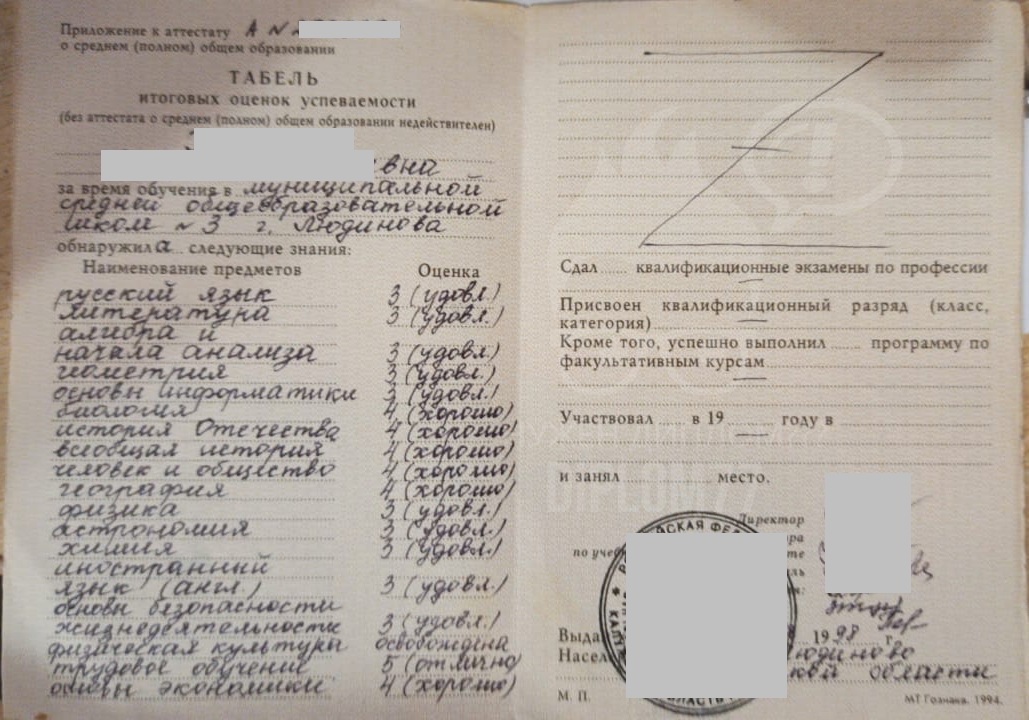 С 1994 года аттестаты стали выглядеть так. К основной корочке прилагалось приложение — табель с оценками.