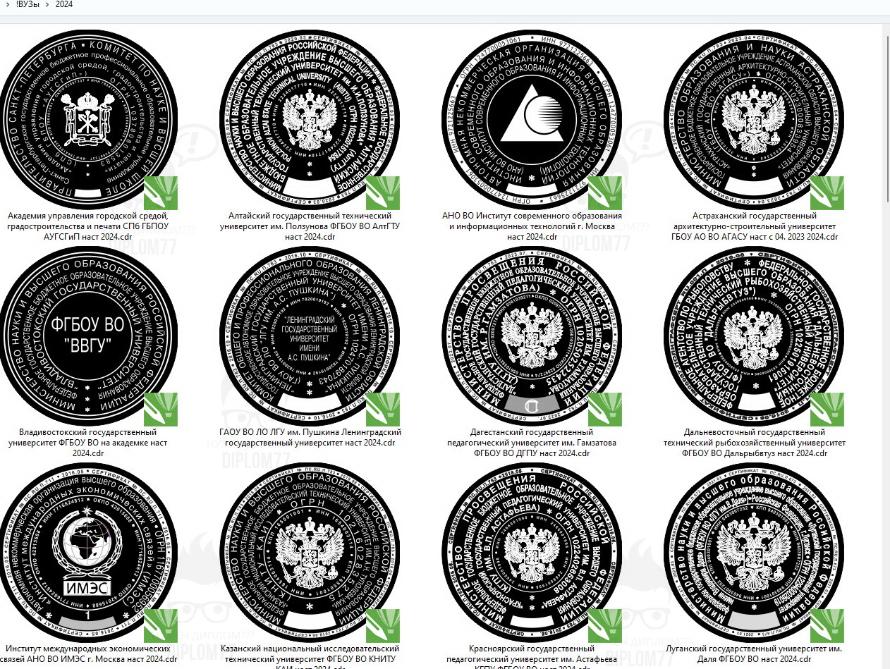 Чтобы вы смогли оценить качество исполнения я сейчас вам приведу пример. Я вот тут же взял и зашёл в папочку печатей, которые были на документах 2024 года. Это всё настоящие печати. Их в этой папке много, на весь экран не помещаются (обратите внимание на бегунок справа). Так вот, чтобы оценить качество отрисовки предлагаю вам найти в Интернете любой документ от одного из этих ВУЗов и сравнить печать. Обычно это можно сделать или на сайте ВУЗа в разделе «Документы». Или в Яндекс-картинках по запросу «диплом или справка из такого-то ВУЗа». Не поленитесь — сравните оригинал. И вы поймёте наш уровень профессионализма.