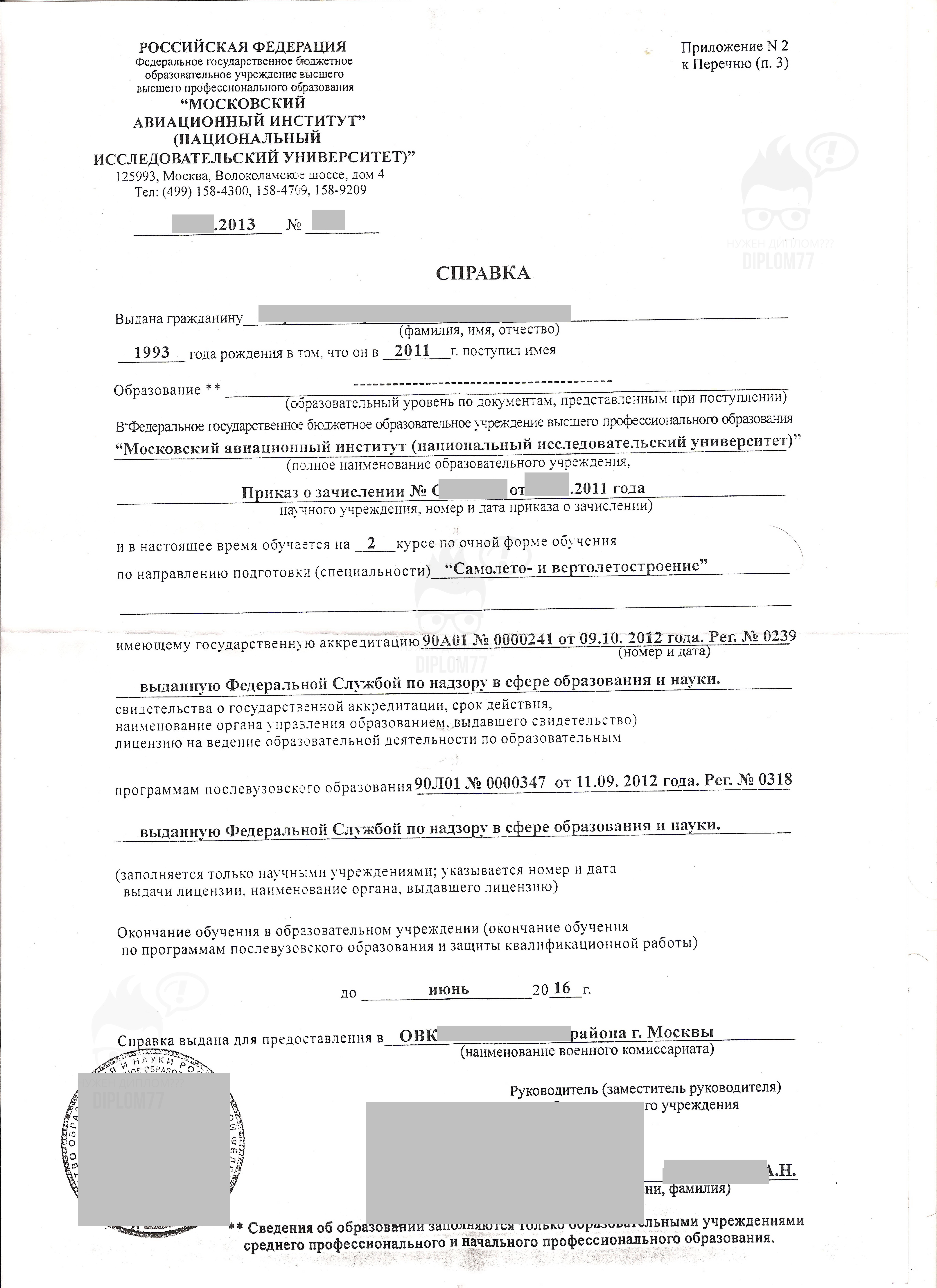 - Приложение №2 к перечню 3 для военкомата из ВУЗа (отсрочка от армии)