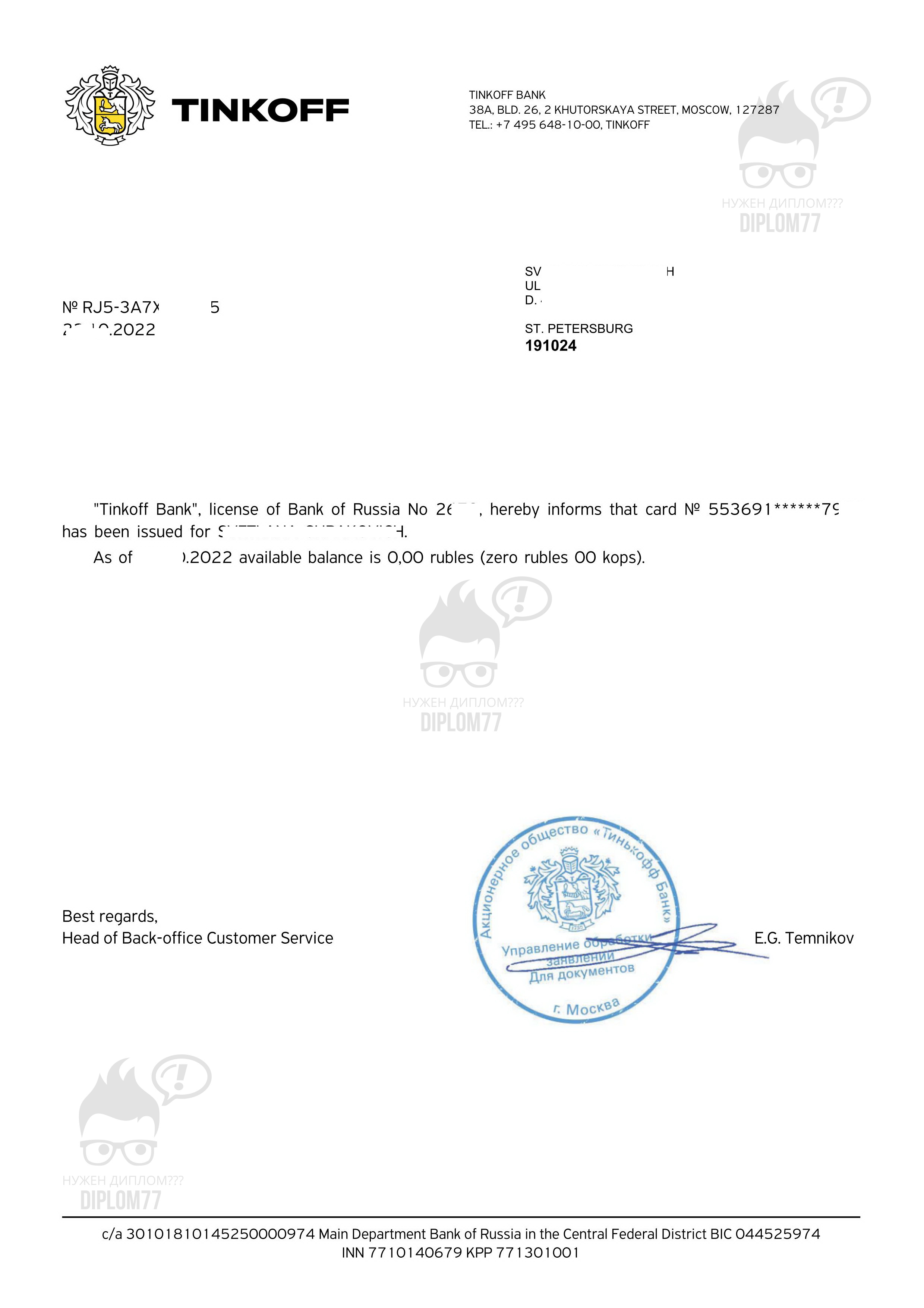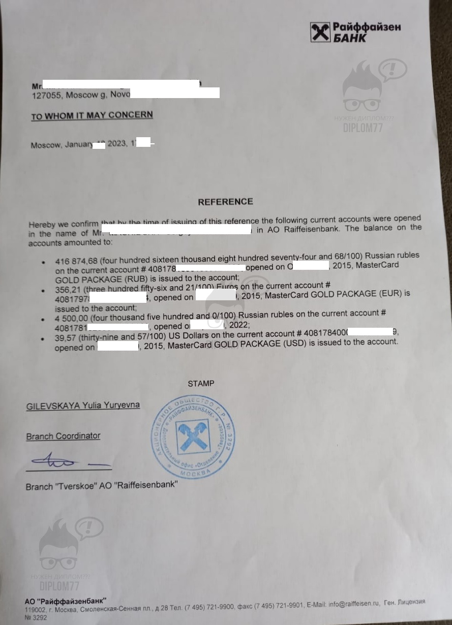 Диплом77 много лет делает такие справки, имеет огромную базу от всех банков России и не только. И лучшим вариантом купить справку о состоянии счёта (доступном балансе) является заказать её на нашем сайте. Напишите нам на Ватсапп или Телеграм. И можете выслать ваш образец (если есть). Мы предварительно вышлем вам макет на согласование. Если что-то не понравится, то переделаем под ваши требования. Также можем доставить готовый документ в любую точку мира.