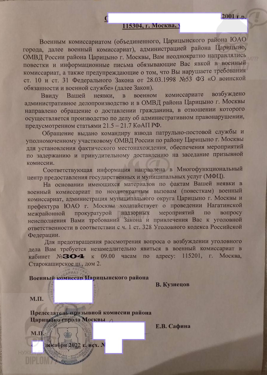 Вопрос: Здравствуйте, мне нужна повестка из военкомата