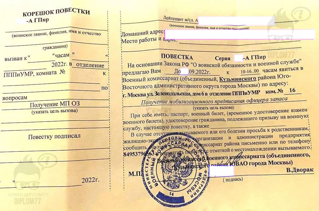 Ответ: Здравствуйте. Высылайте образец на WhatsApp +79052590480 или е-мейл zakaz@diplom77.com . Сделаем такую же повестку только на ваши данные. Стоить будет 10 000 рублей. Делается за 2-3 рабочих дня и плюс время доставки. Подробнее о вариантах оплаты и доставки здесь: https://d77oe.cfd/dostavka