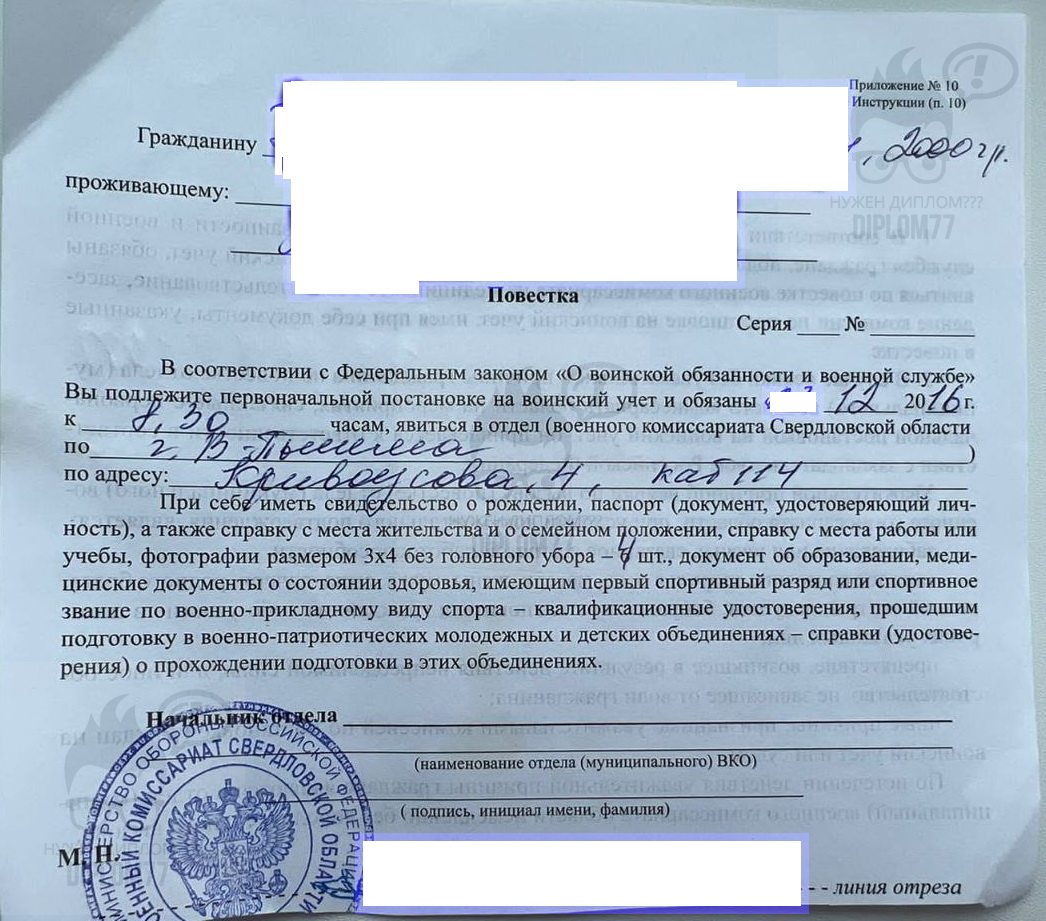 Вопрос: Приветствую. Необходима повестка в военкомат с мокрой печатью. Бланк, образцы есть