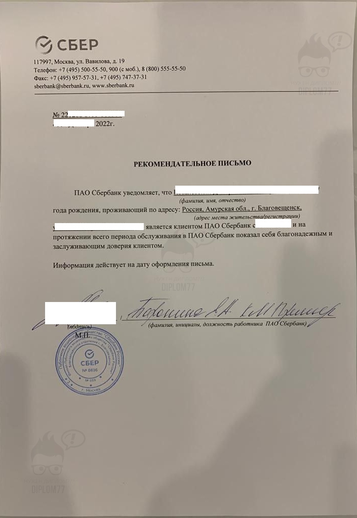 Решил написать отдельную страницу по очень популярной в последнее время позиции — рекомендательному письму. Почему-то часто его стали заказывать из-за границы. Видимо большому количеству релокантов надо подтверждать свою благонадёжность перед новыми работодателями. И если в России этот метод используется не так часто, то заграницей рекомендательные письма довольно популярное явление при увольнении. Если вам надо купить рекомендательное письмо, независимо где вы его будете предъявлять (в России или за рубежом, на русском или английском) Диплом77 изготовит данный документ профессионально и быстро.